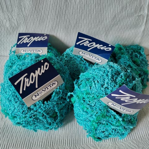Viimeisessä kuvassa näkyy myynnissä olevat samat kirkkaan turkoosit Tropic langat (kaikki samaa erää). Kaikki viimeisen kuvan kerät yhteensä 6 euroa. Kuvassa turkoosi näyttää kellertävälle. Se on oikeasti raikkaan turkoosi.