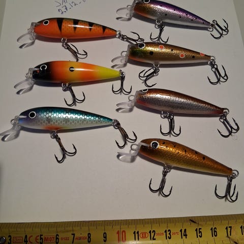 Lohi- ja taimenvaappuja. Huuskimus ja Kolli -vaaput hyvissä loppukauden väreissä (Huuskimus ei stanssia). Jurmu ja vanha LJ -vaappu puolestaan sopivissa sadekelin väreissä.