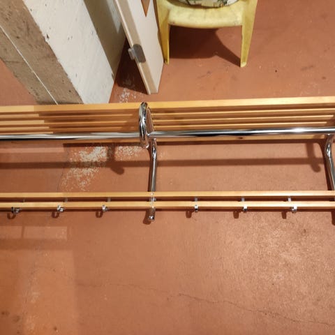 Kokonaisleveys 77cm, puuosan korkeus noin 10cm. Koukkuineen kaikkineen korkeus noin 14-15cm. Puuosan paksuus pari senttiä.