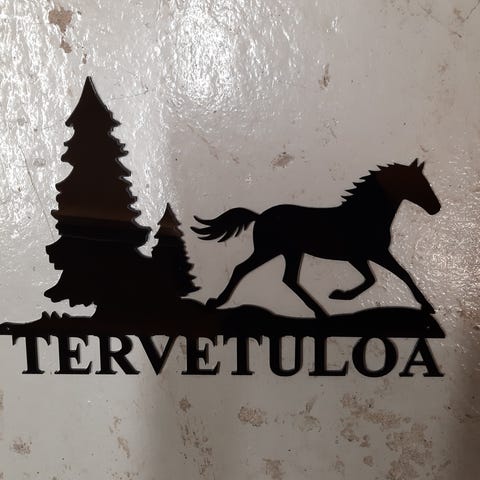 Tervetuloa kyltti hevosenpää figuurilla. Puupalan koko hevosen pään takana n 13x20cm. Ripustetaan ketjulla oveen.