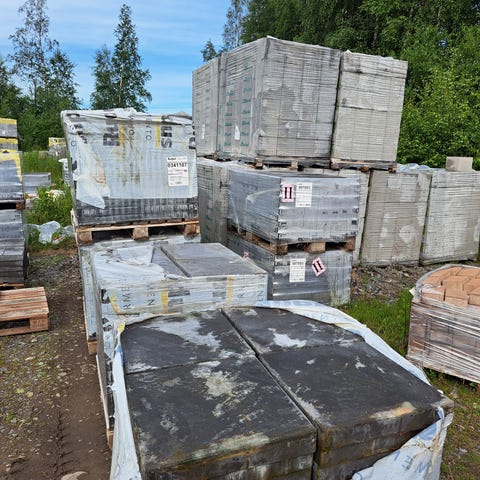 Erä betonilaattoja (20 kpl + 1 haljennut), mitat: pituus 50 cm, leveys 26,5-29,5 cm ja korkeus 7 cm