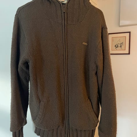 Työtakkityyppinen kevyesti topattu musta puuvillatakki, rintatasku, lämmittelytaskut ylhäällä ja läpälliset taskut alhaalla, koko L. Vika kuvassa näkyy toisen läppätaskun ulkoreuna. Tahroja joita en ole yrittänyt pestä. Voihan tämä mennä työvaatteeksikin.
