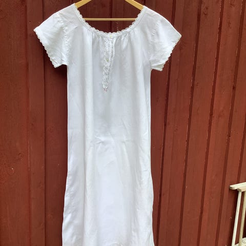 Alushame, pellavaa, noin 1900, kiristysnauha takana, kaunis käsinommeltu helma, koko suunnilleen 40-42, pituus 77 cm, pienet ruostetahrat helmassa.