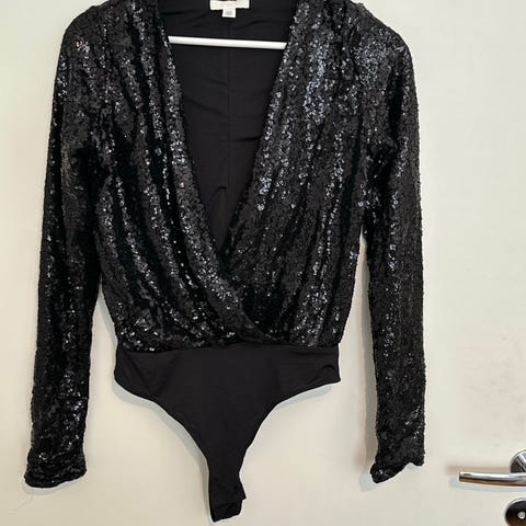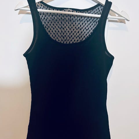 Musta shifonkitoppi olkaremmeillä, alla läpinäkymätön musta trikookerros, kyljessä vetoketju. Kai-kai 37 cm (ei jousta), pituus 72 cm.