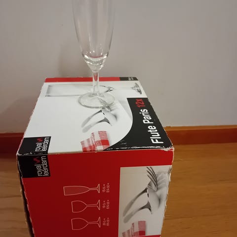 Myynnissä hyväkuntoiset royal leerdam claret merkkiset champpanjalasit laatikossa.