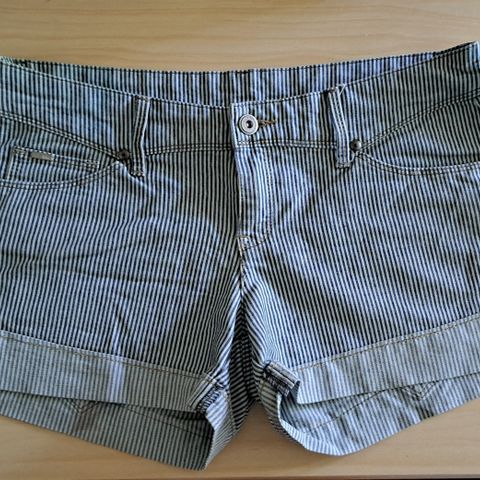 Myydään kevyet ja ilmavat Mango Casual-merkin shortsit kesäkäyttöön. Tummansininen pohjaväri ja valkoinen pilkkukuosi. Takana koristeellinen tasku. Kangas on mukavan ohutta ja hengittävää, sopii hyvin lämpimiin säihin. Kunto on hyvä, ei näkyviä tahroja tai reikiä. Käytetty vähän.