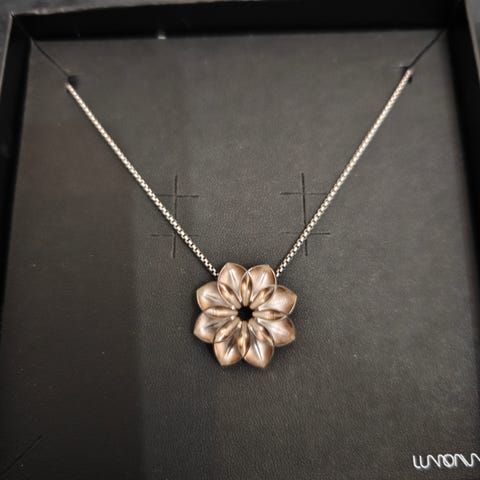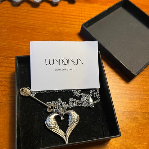 Lumoava korun iso, 35*36mm, sydänriipus. Ketjun pituus 42cm, papukaijalukko ja paksuus ketju. Koru on hopeaa.