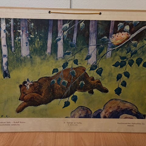 Aukisti Salo Rudolf Koivu. Suomalaisia satukuvia. Tiainen ja karhu. Karhun pako. Koulutarpeiden Keskusliitto Oy, Helsinki