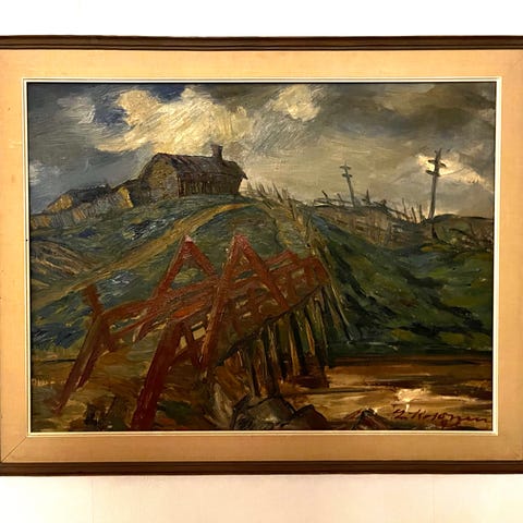 Erkki Kulovesi 1921 "Ratinaa" öljyväri kankaalle mitat kehysten päältä korkeus n.50cm leveys n.70cm kuva-ala korkeus n.39,5cm leveys n.59cm, vanhat kehykset + jokunen jälki