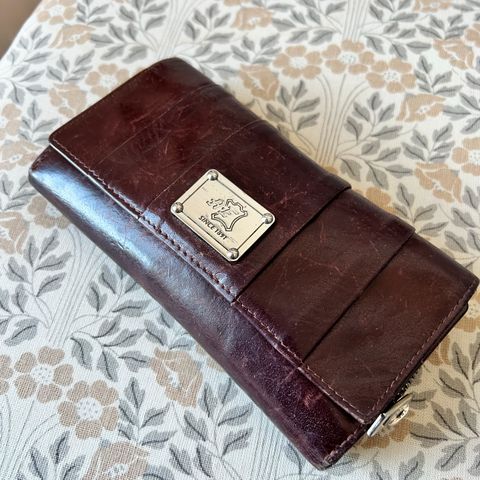 Punainen retro nahkalompakko. Korkeus 10 cm ja leveys 17 cm. Säädettävä toimiva lukko. Made in Finland. Postitus onnistuu.