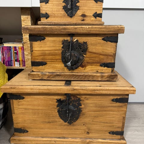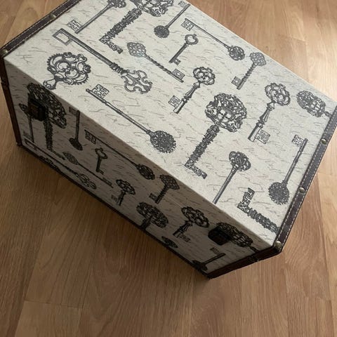 Ruskea sisustusarkku ristikko-ja remmikuvioinnilla.