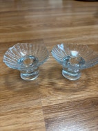 Käyttämättömät Nanny Stillin Riihimäen lasille suunnittelemat Kehrä kynttilänjalat. Kynttilänjalat olivat tuotannossa v. 1975-80. Kynttilänjalan korkeus on 3,8 cm ja halkaisija 6 cm.
