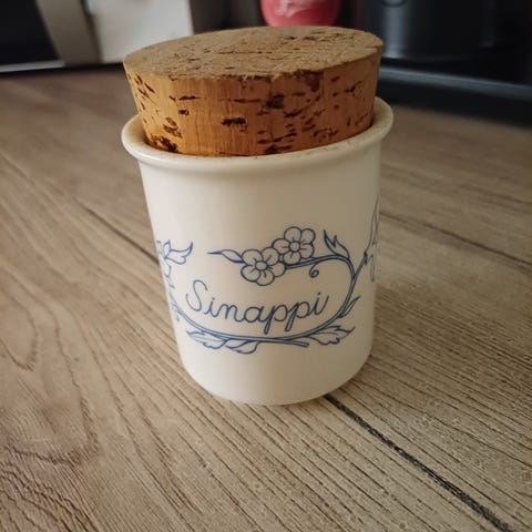 Myydään Arabia Sininen keittiö -purkki korkkikannella. Korkeus 8,5cm ja halkaisija 10cm. Koristeen suunnitellut Raija Uosikkinen. Ollut vitriinissä koristeena, kunto kuin uusi. Hinta 20€. Nouto Oulusta Höyhtyältä tai postikulut ostajalle. Mmm.