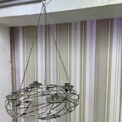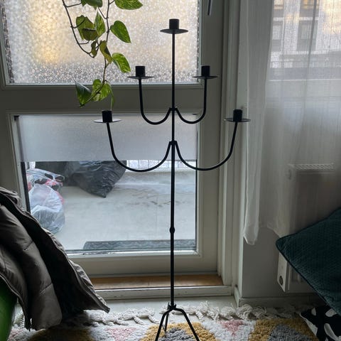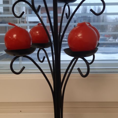 Kynttelikkö 6:lla kynttilällä. Olen itse laittanut kesäksi kynttelikköön valkoisia kukkaoksia ja ruskeat läpinäkyvän kukkanauhan, ne saa poissa.