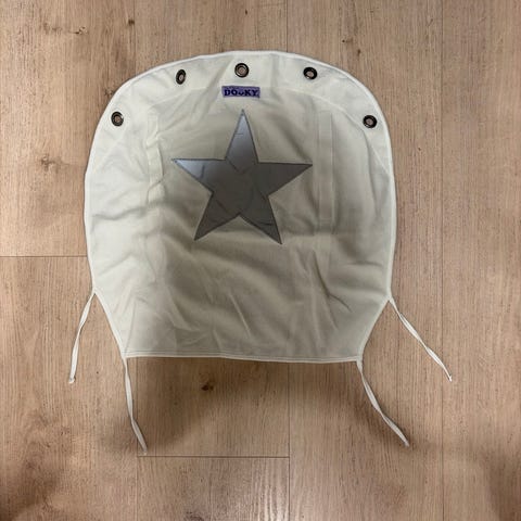 ”Kuomuverho hengittävää materiaalia. Pimennysverho kiinnitetään kolmen kiinnitysklipsin ja työntöaisaan tulevien tarranauhakiinnikkeiden avulla. Koko 80 x 60 cm.”