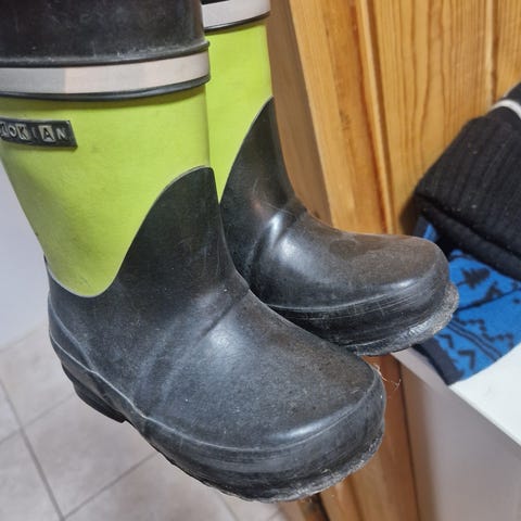 Myydään hyväkuntoiset kumisaappaat koko 23, Peuhu. Ehjät, lapsi laitoi tarran yhteen saappaan päälle, eli on tarran jälki.