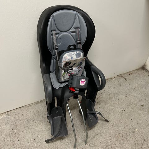 Hyvässä käyttökunnossa oleva istuin, alkuperäiset jalkaremmit katkenneet ja toiseen tehty oma remmi. Sisältää kiinnitysadapterin pyörän satulaputkeen.