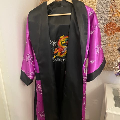 83 % polyesteriä ja 17 % puuvillaa. Kangas kiiltävää päältä. Pituus olkapäältä 114 cm ja koko M - L. Vyö ja taskut. Hyvin vähän käytetty.