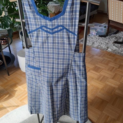 Vanha retro sinivalkoinen emännän essu kaapin perältä, ei ole ollut aikoihin käytössä, siisti kunto. Pään yli vedettävä ja etu- ja takapuoli erikseen naruilla vyötärölle sidottava, eli säätövaraa on reilusti. Katso tarkemmat mitat kuvista. Ompelijan itselleen tekemä.