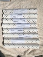 Valkoinen pohja jossa sinisiä tähtiä , valon taittuessa sopivasti tähdissä hieman metalli hohdetta.