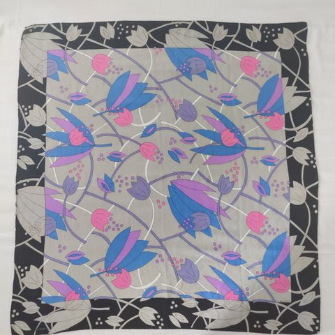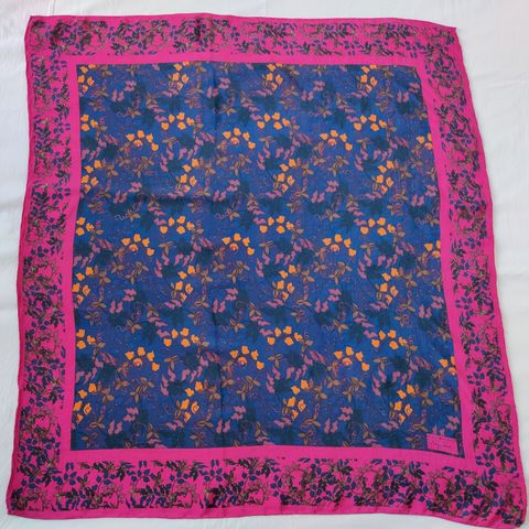 Vielä hyvässä käyttökunnossa säilynyt ehjä ja siisti huivi, 100% luonnonsilkkiä. Kooltaan ajattoman tyylikäs huivi on 77cm x 73cm. Olen juuri pessyt huivin käsin silkinpesuaineella ja se on valmis käyttöönotettavaksi. Postitus tavallisena kirjeenä joka tulee postiluukusta/ postilaatikkoon 2,80e.