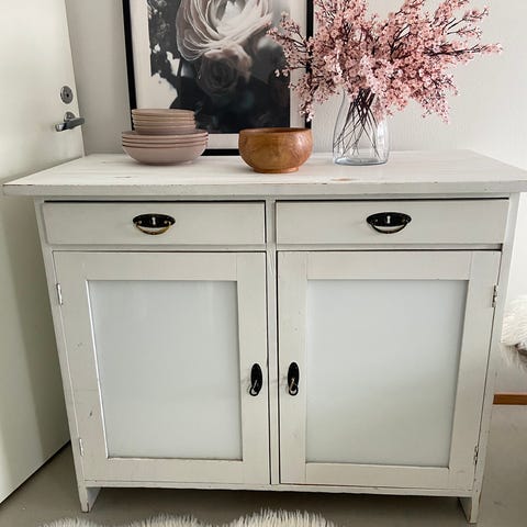 Tuotetiedot: Antiikkinen kaappi, jossa on yhteensä neljä vetolaatikkoa ja kolme kaappiosaa. Keskellä olevan kaappiosan sisällä on kuusi pientä vetolaatikkoa ja säilytystilaa. Sivuissa olevissa kaappiosissa on yhteensä kaksi kiinteää hyllyä.