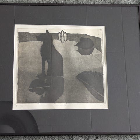 Juhani Rintamäki kollaasi sanomalehtipaperi levyllä + muutama ryppy, mittoja kehysten päältä korkeus n.41,5cm leveys n.32cm kuva-ala n.35,5x26cm