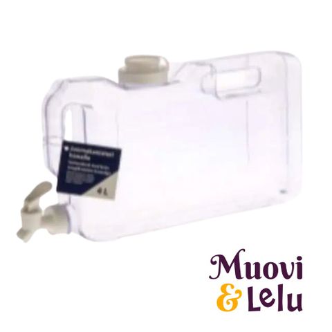 Tämä kätevä vesikanisteri on läpinäkyvää muovia, ja tuotteessa on täyttökorkki päällä.