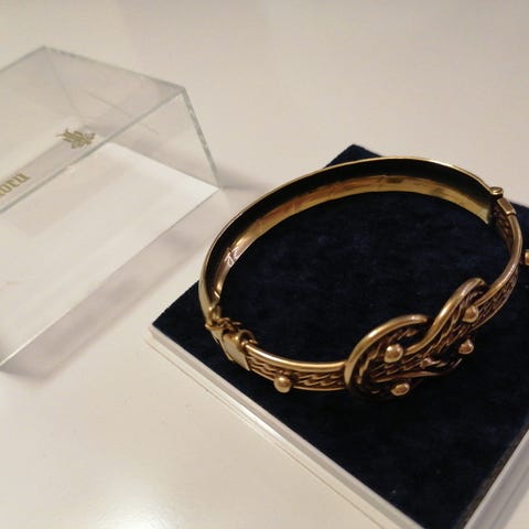 Pronssinen Teljän neito rannekoru. Hyväkuntoinen ja siisti, avautuu tappilukolla.