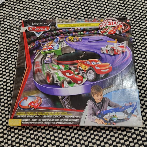 Melkein käyttämättömäksi jäänyt (ostettu 1/25) Cars autorata sis. kaksi mukana tullutta pikkuautoa (kts. kuva).