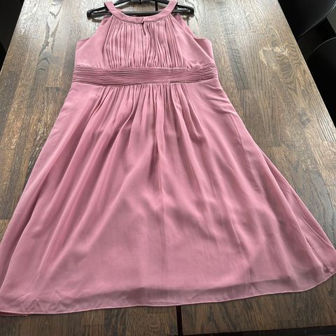 Aivan ihana, kauniisti laskeutuva juhlamekko kesämekko. Vyötäröllä sidottava nauha. Takaa hieman pidempi. Helma röyhelöinen. Kiinniommeltu valkoinen alusmekko. Merkki wallis. Koko 42