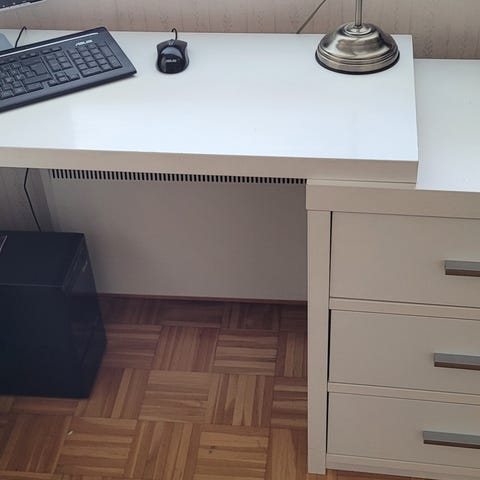 Ollut vähäisessä käytössä työpöytänä muutaman vuoden. Siistissä käytetyssä kunnossa, ehjä ja hyvin tukeva. Pöydän vasemmalla sivulla yksi hyvin pieni jälki (n 1mm), josta kuva.