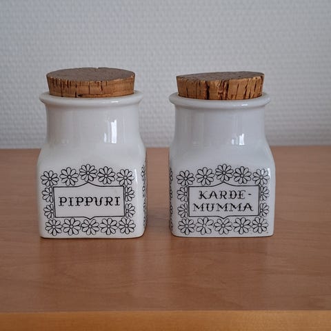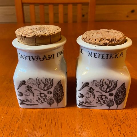 Kaksi maustepurkkia, hyväkuntoisia. 15 e kpl.