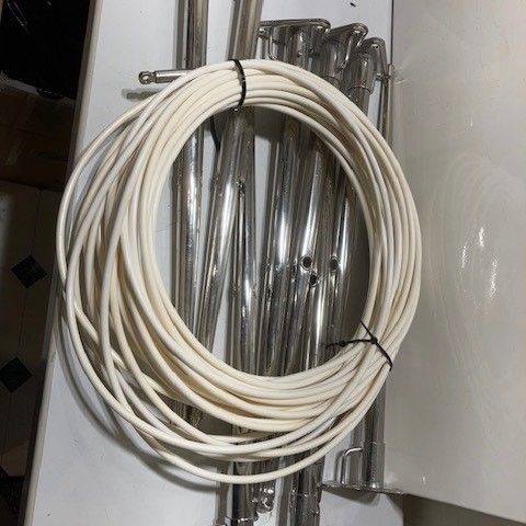 Myydään veneen kaidepuita kiinnikkeineen. Puiden pituudet kiinnikkeineen 90, 81, 75, 74 ja 65 cm. Puut pintakäsitelty, puiden ø 40 mm. Kiinnikkeet ruostumatonta terästä, pituus 10 cm, kiinnitetty kaidepuihin kahdella ruuvilla. Seinäkiinnitys toteutettavissa kolmella ruuvilla, lisänä ruuvisuojat, ø 50 mm. Kiinnikkeillä puut saadaan n 7 cm irti seinästä. Valmistaja raumalainen LSKK. Kaikki yhteensä 50 €.