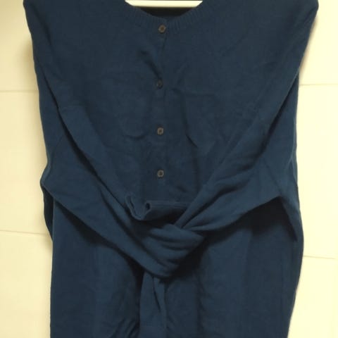 Edessä napit ja pienet taskut. Siisti kunto, pidetty muutamia kertoja. Kuvassa mielestäni hieman neuleen sävy haaleampi kun luonnossa, taivaansininen joka taittaa inan lilaan.