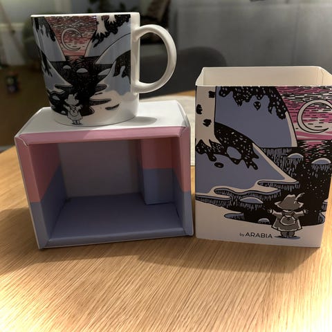 Käyttämätön muumin päivä -muki tarralla. Tarjoa hintaa.