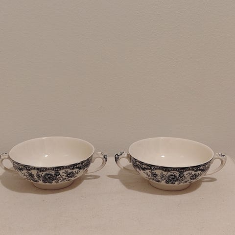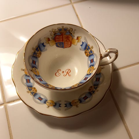 Sisäreunassa on kruunumerkintä "ER" (Elizabeth Regina), jota käytettiin kuningattaren hallintakauden symboleissa. Kupit ovat matkamuistoposliinia, joita valmistettiin rajattu erä Staffordshiren alueella (esim. Rosina, Queen’s, Colclough).