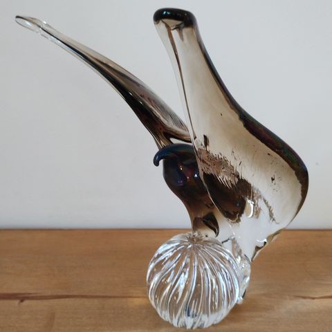 Upea suomalainen taidelasilintu, suunnittelija Lasse Sirén. Käsintehty, kauniin kiiltävä pinta, jossa yhdistyy sinertävä ja vihertävä lasimassa orgaaniseen, pistekoristeltuun muotoon. Läpinäkyvä pää luo herkän kontrastin rungon väreihin.