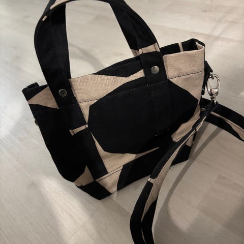 Todella siistikuntoinen Marimekon laukku, irrotettava pitkä hihna. Koko noin 24x20cm