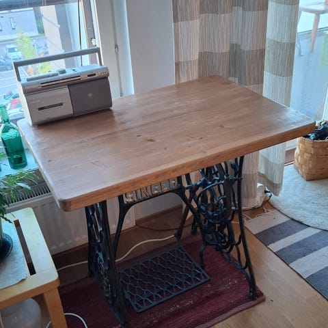 Tosiaan 3 Singer ompelukone pöytää, oudon pintaisella pöytä levyillä. On aito levy alla ja päällä liimattu vanerilevy. Nämä ovat hyviä tietokone pöytinä, saa polkea jalkojaan. Ovat myös hyviä telineitä jos tarve jotain korkeammalla tehdä. Tukeva työtaso.