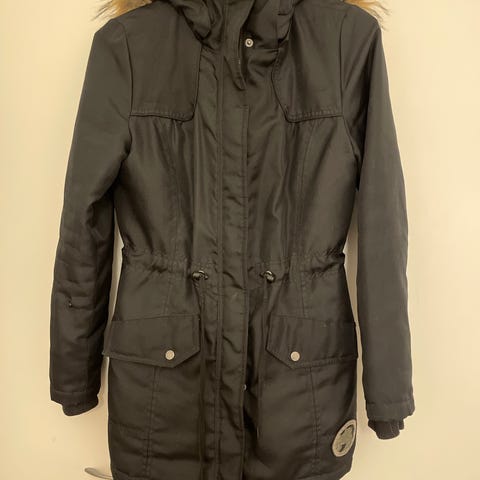 Pituus 165cm pitkällä käyttäjällä n. reiden puoliväliin, peittää siis takapuolen hyvin. Kivat isot taskut ja kiristys vyötäröllä