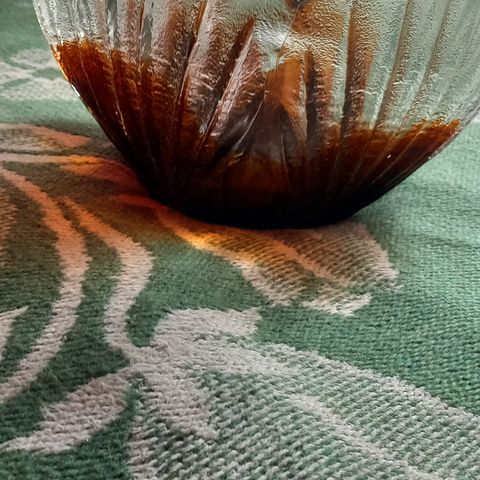 Kaunis, hiottu lasimalja kullanvärisellä sangalla. Kork.7 cm, pituus. 21cm. Lev. 9 cm