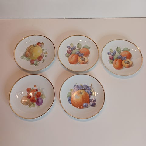 Tarjolla Arabian vanhoja, pieniä Hedelmä - lautasia 4 kpl ja yksi hiukan nuorempi, saman sarjan syvä lautanen. Lautasissa on siirtokuvakoristeet. Reunoissa ei ole kultauksia, kuten joissain vastaavissa on.
