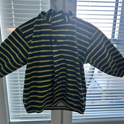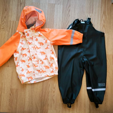 Myydään settinä Remun herkullisen värinen Gaia eco -sadetakki ja Cirafin mustat kurahousut. Sadetakin koko 92cm, kurikset 86cm. Molemmat ostettu uusina syksyllä -24. Olleet yhtäaikaa käytössä 86-92cm kokoisten vaatteiden kanssa. Setti ehti olla käytössä vain lyhyen aikaa kasvupyrähdyksen vuoksi. Molemmat edelleen täysin ehjiä ja oikein siistikuntoisia, ulkopinnoilla paikoitellen ihan pientä pintalikaa. Moitteena takin sisähelmassa laajemmalla alueella oleva lika/värjäymä (ks. kuva 5). Konepestävät, en ole nähnyt tarvetta pestä. Kaupan päälle saa halutessaan paljon käytetyt koon 22 flamingo-kumisaappaat (pohjallisen pituus raksamitalla n. 14,5cm, ks. kuva 10).