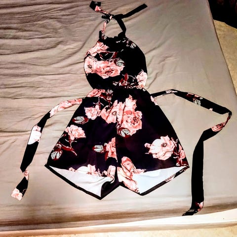 FBsistersin shortsihaalari. Koko M. Kuminauhat hihansuissa ja vyötäröllä. Edessä napitus. Vyötäröllä vyö. Kai-kai 48cm. Olka-helma noin 77cm. Pohjaväri musta.