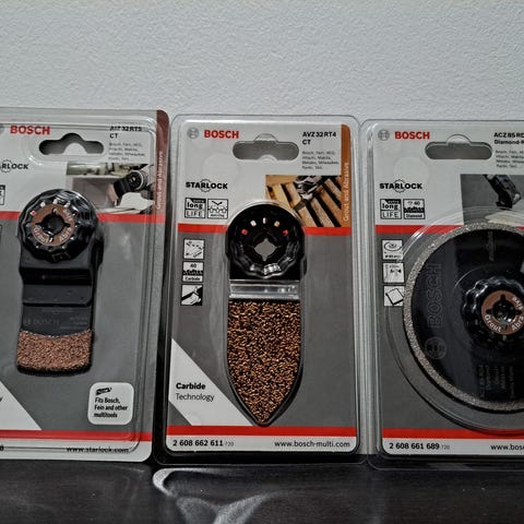 Kuvan uusi ja avaamattomassa pakkauksessa oleva monitoimityökalun terä.