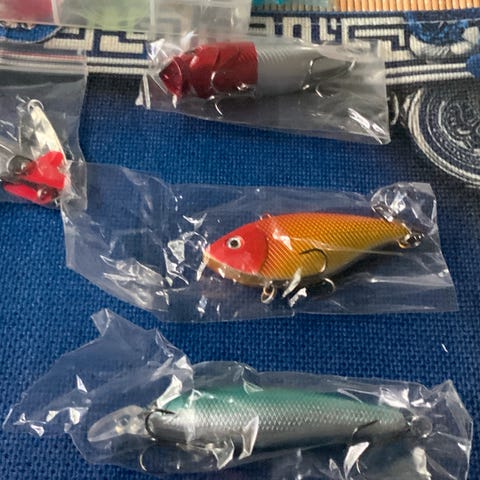Viisi heittokohoa , 29 jigiä , käytettyjä , melkoinen määrä uusia koukkuja , katso kuvat