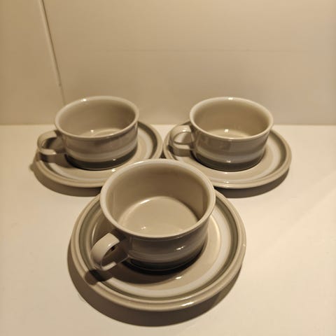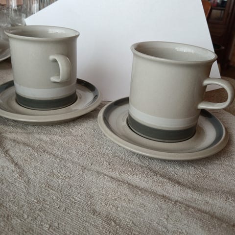Hieman käytön jälkiä lautasessa pieni jälki ja kahvikupin korvan ympäri "lohkeama", mutta korva on tukevasti kiinni. Nouto Sipoosta tai voin lähettää ToriDiili-palveluna.