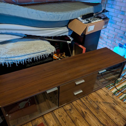 Hyvässä kunnossa oleva TV-taso, jossa myös mukavasti säilytystilaa.