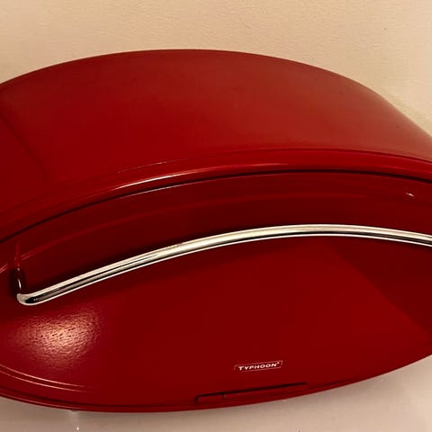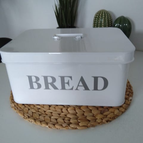 Metallinen leipälaatikko. Aukeaa etuosasta ja päällä myös aukeava lokero. Metallinen. Nouto ja käteinen.